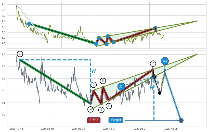 ➣ D点拟合预测价格7.41,距离最后交易收盘价格5.20相差 +42.46%