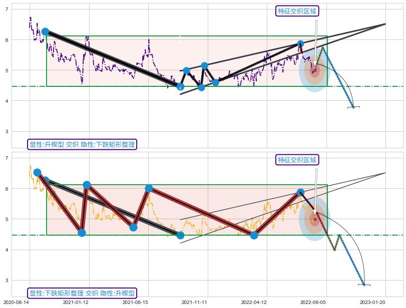 ➣ 下跌矩形整理:猜想临近关键支撑位突破点 → 临近拐点下跌 → 风险信号 → 大趋势均值回复