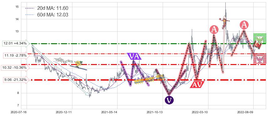 ♘ 支撑价格位10.32,可信任强度69.90%,距离最后交易2022-08-12形成的收盘价格11.51相差 -10.36%