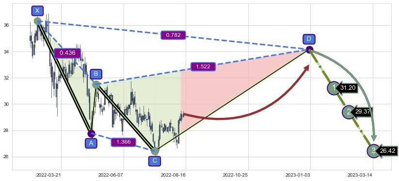 ➢ 谐波赛福:b持续蓄力下跌击穿越过c:猜想报复性拉升 → 上涨 →【拐点】强支撑临近 → 大趋势均值回复