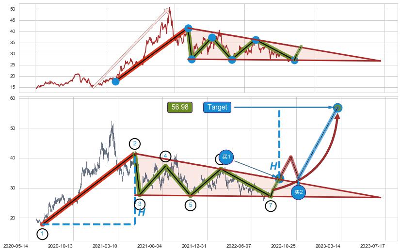 ➣ 上升对称三角整理:猜想上涨target达成后 → 下跌 → 风险信号 → 大趋势均值回复