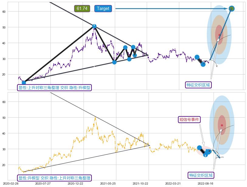 ➣ 下跌身怀六甲 + 上升对称三角整理临近target阻力拐点下跌信号叠加后【目标达成率】极低,【看空】信号叠加【存续影响极大】