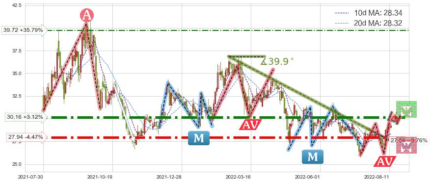 ♘ 支撑价格位27.94,可信任强度93.86%,距离最后交易2022-08-12形成的收盘价格29.25相差 -4.47%