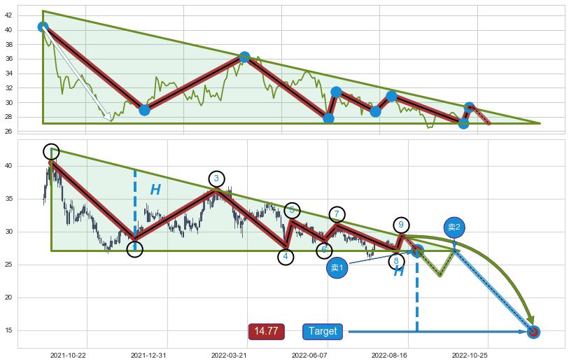 ➣ 下降三角整理:猜想临近关键支撑位突破点 → 临近拐点下跌 → 风险信号 → 大趋势均值回复