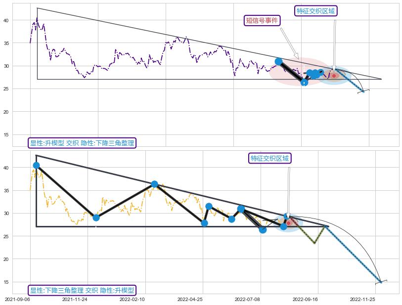 ➢ 升楔型属【短级别信号事件】下降三角整理属【长级别信号事件】长短周期组合信号事件, 短长事件长度比14.93%