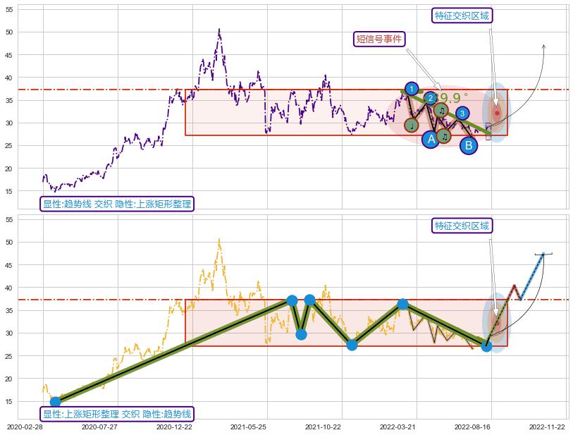 ➢ 趋势线属【短级别信号事件】上涨矩形整理属【长级别信号事件】长短周期组合信号事件, 短长事件长度比19.38%