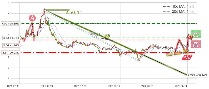 ♘ 阻力价格位5.73,可信任强度50.79%,距离最后交易2022-08-12形成的收盘价格5.47相差 +4.84%