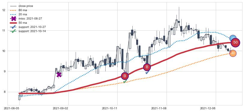 ➢ 最优均线组合共正确确认支撑阻力信号9处,正确确认率 64.29%