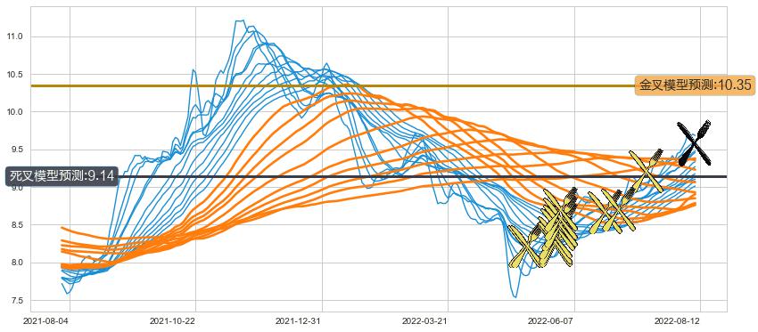 ➢ 10小时均线于(2022-08-11: 9.58)形成【死叉】基于【死叉历史模型】预测死叉后最低波谷价格: 9.14, 死叉后最低价格9.53,尚未达到预测最低波谷价格, 预期继续下跌