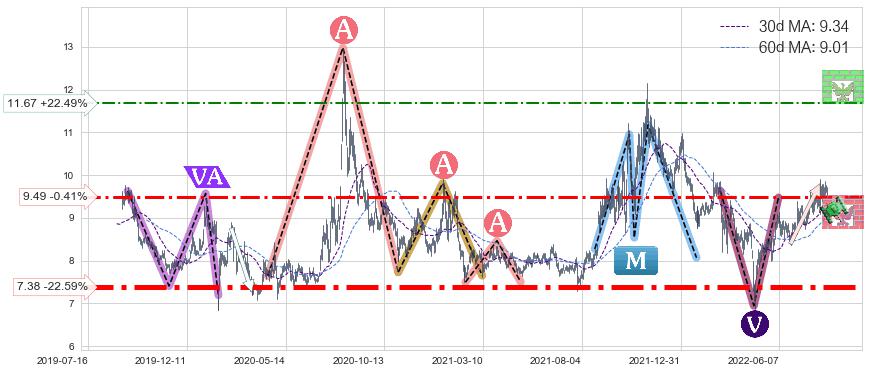 ♘ 支撑价格位7.38,可信任强度99.95%,距离最后交易2022-08-12形成的收盘价格9.53相差 -22.59%