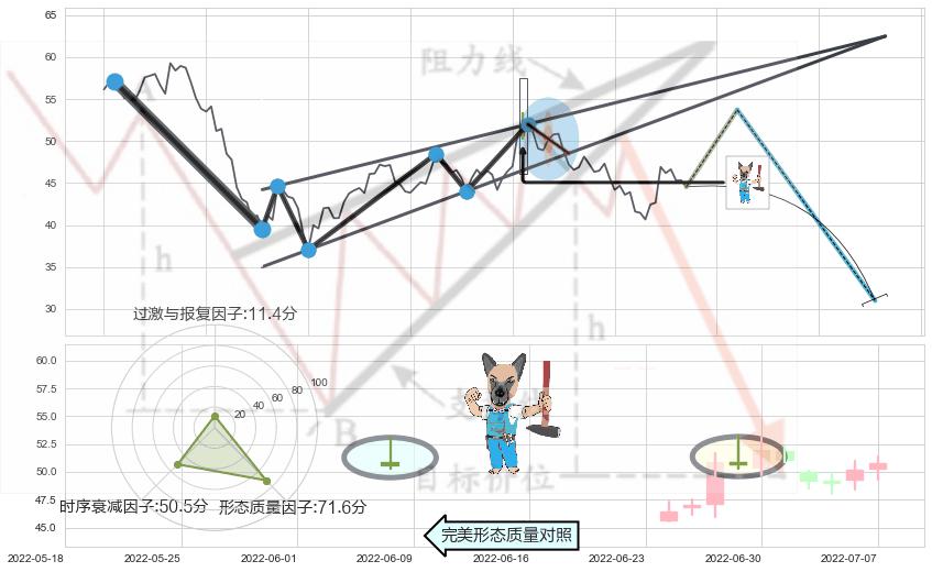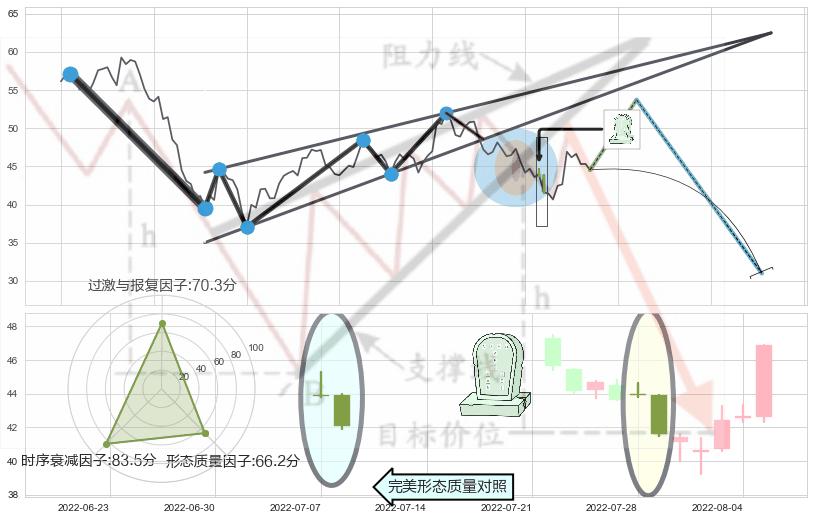➢ 看跌(高位倒锤头)流星线 🔜 升楔型支撑破位转换阻力下跌 综合量化分数:44.58 【偏空】