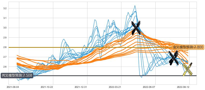 ➣ 70小时均线于(2022-04-21: 2.996)形成【死叉】基于【死叉历史模型】预测死叉后最低波谷价格: 2.660, 死叉后最低价格2.410,已经下跌超出预测最低波谷价格, 预期反弹