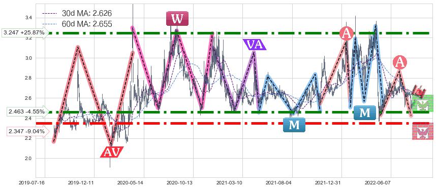 ♘ 阻力价格位2.463,可信任强度85.52%,距离最后交易2022-08-12形成的收盘价格2.580相差 -4.55%
