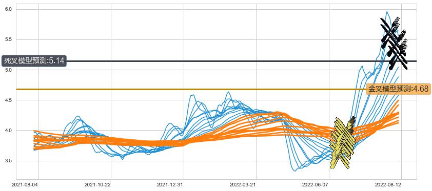 ➣ 34小时均线于(2022-08-11: 5.20)形成【死叉】基于【死叉历史模型】预测死叉后最低波谷价格: 4.95, 死叉后最低价格5.15,尚未达到预测最低波谷价格, 预期继续下跌