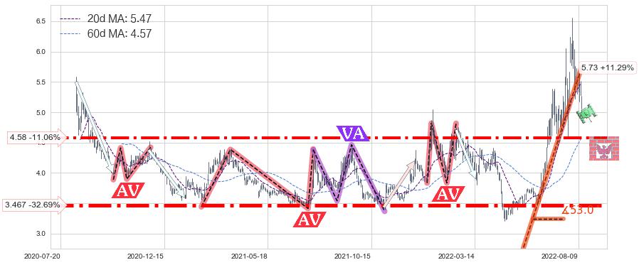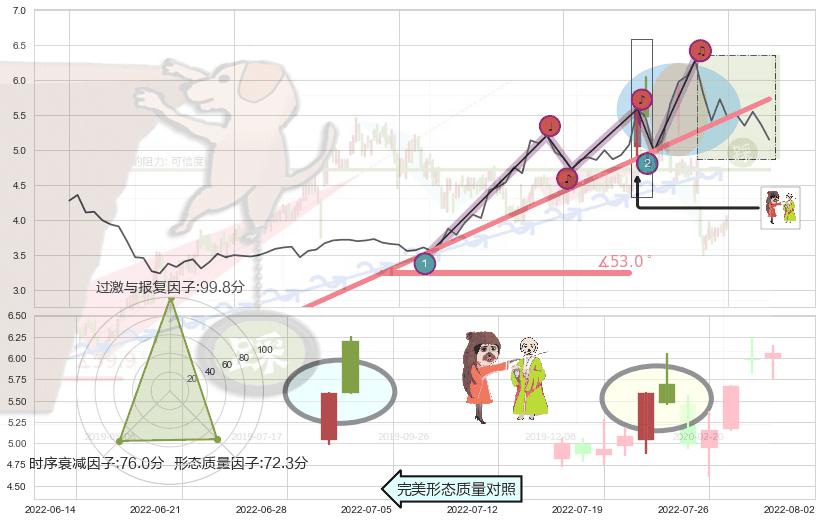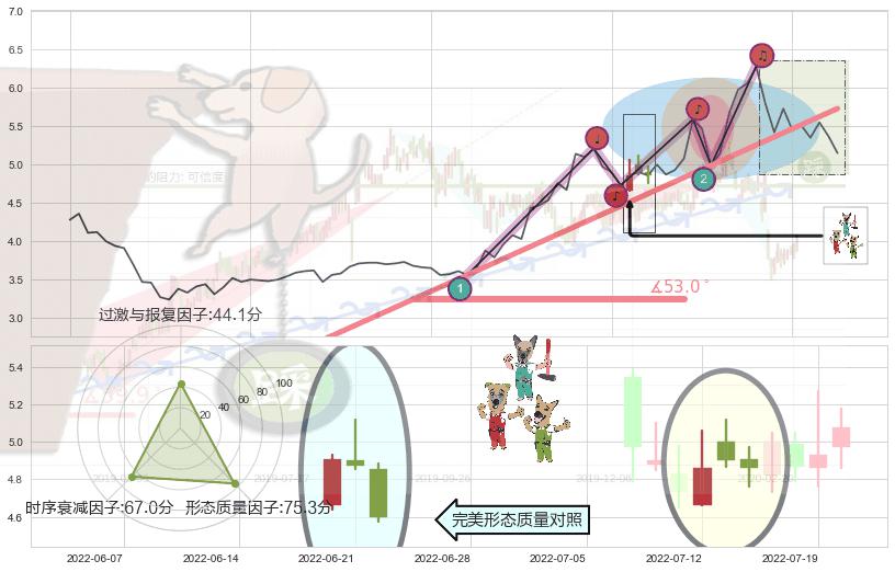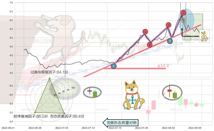 ➣ 2022-04-12-2022-08-12上升趋势存在反转[风险],其原上升趋势的支撑位(5.73)已破位[强阻力信号],原上升趋势角度: 53.0˚