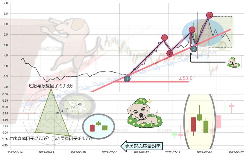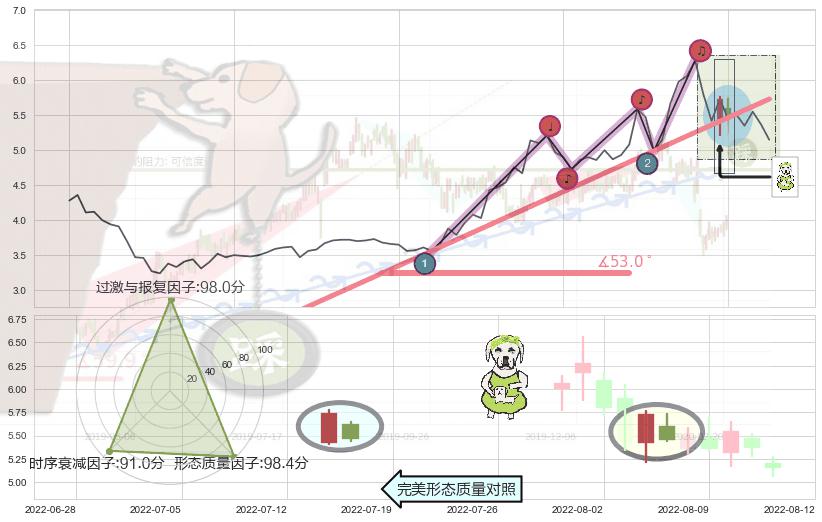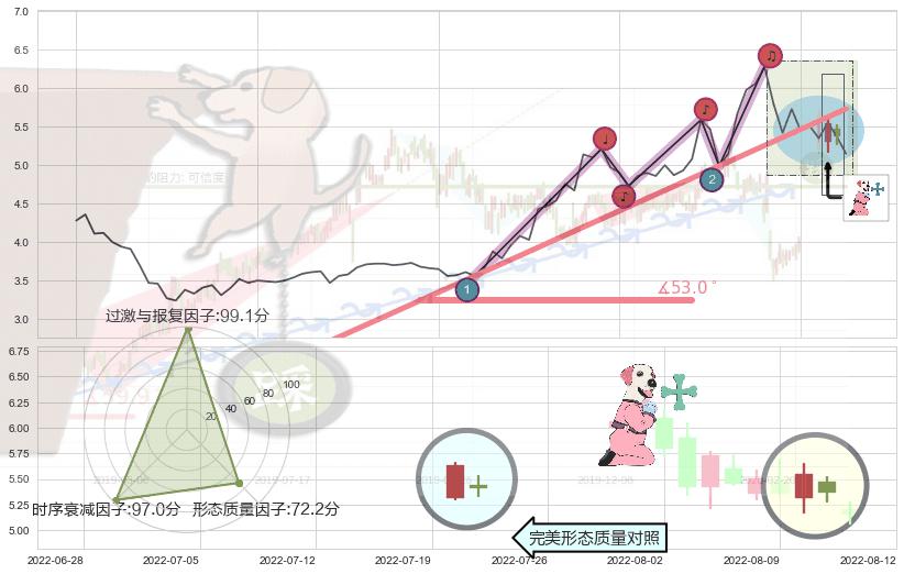 从2022-04-12至2022-08-12,共包含85个交易日,阶段股价上涨22.55%,阶段股价变动位移路程比: 1 : 10,上涨趋势角度: 53.0