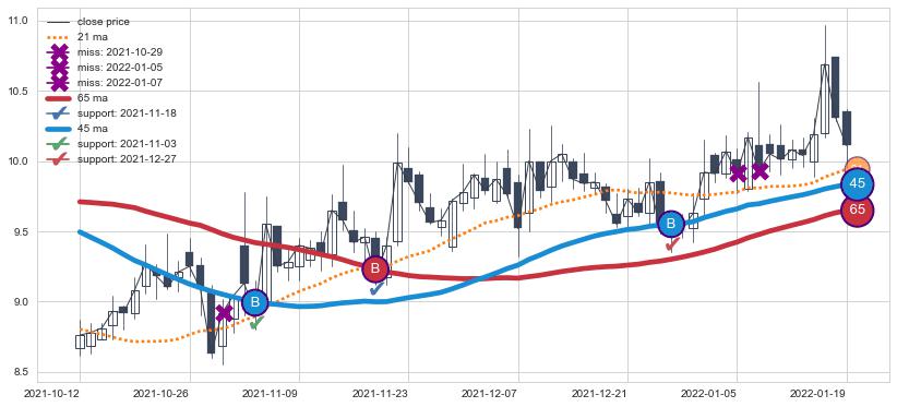 ➢ 最优均线组合共正确确认支撑阻力信号13处,正确确认率 65.00%
