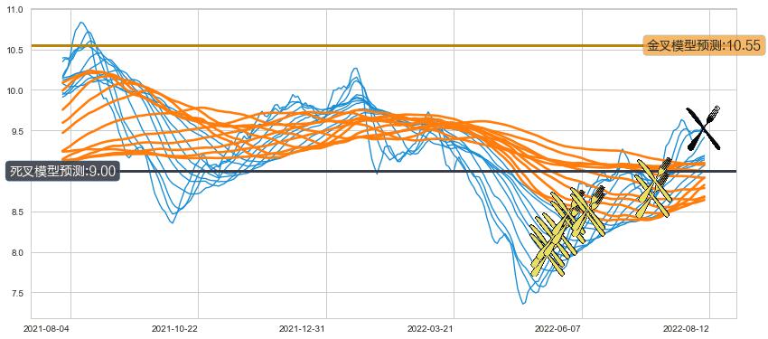 ➢ 13小时均线于(2022-08-11: 9.52)形成【死叉】基于【死叉历史模型】预测死叉后最低波谷价格: 9.00, 死叉后最低价格9.48,尚未达到预测最低波谷价格, 预期继续下跌