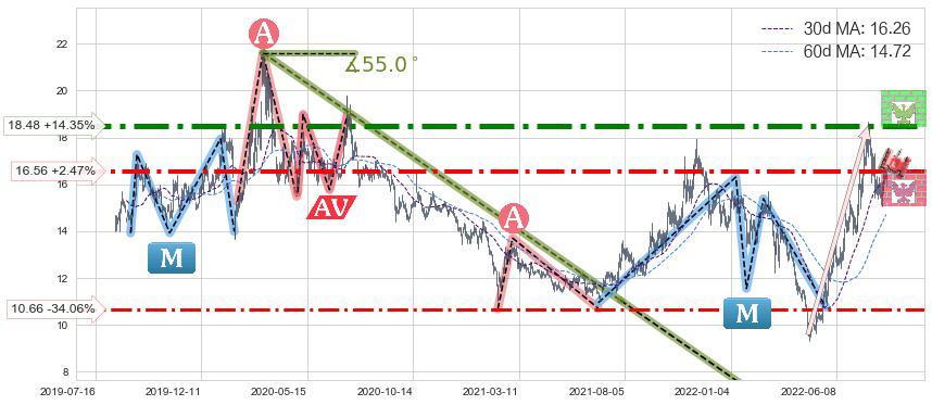 ♘ 阻力价格位18.48,可信任强度95.28%,距离最后交易2022-08-12形成的收盘价格16.16相差 +14.35%