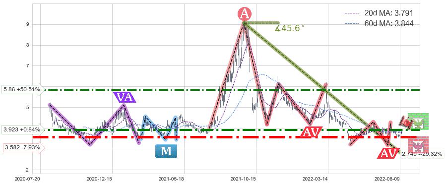 ♘ 阻力价格位5.86,可信任强度66.72%,距离最后交易2022-08-12形成的收盘价格3.890相差 +50.51%