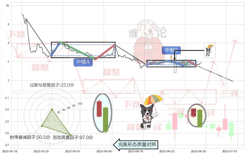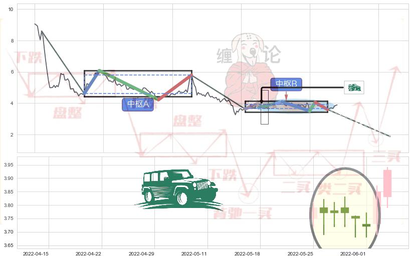 ➣ 【中枢B】:2022-05-10-2022-08-03,中枢由7笔构成,共61交易日, ZG=3.960, ZD=3.720