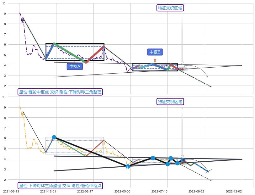 ➢ 缠论中枢点与下降对称三角整理信号事件周期长度级别相同,同周期信号事件