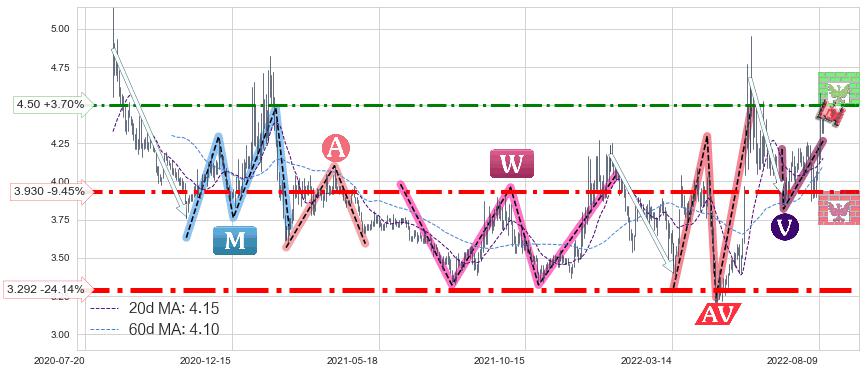 ♘ 阻力价格位4.50,可信任强度55.64%,距离最后交易2022-08-12形成的收盘价格4.34相差 +3.70%