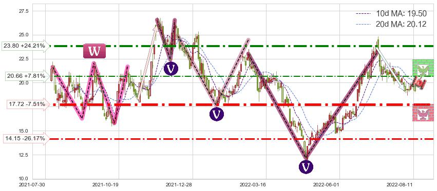 ♘ 阻力价格位20.66,可信任强度51.41%,距离最后交易2022-08-12形成的收盘价格19.16相差 +7.81%