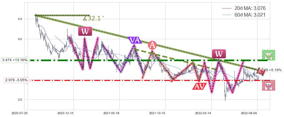 ♘ 阻力价格位3.474,可信任强度92.34%,距离最后交易2022-08-12形成的收盘价格3.070相差 +13.16%
