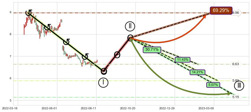 ➢ 5.1: 预测当前第5浪位置(2022-08-04, 6.61),仍然有下跌空间