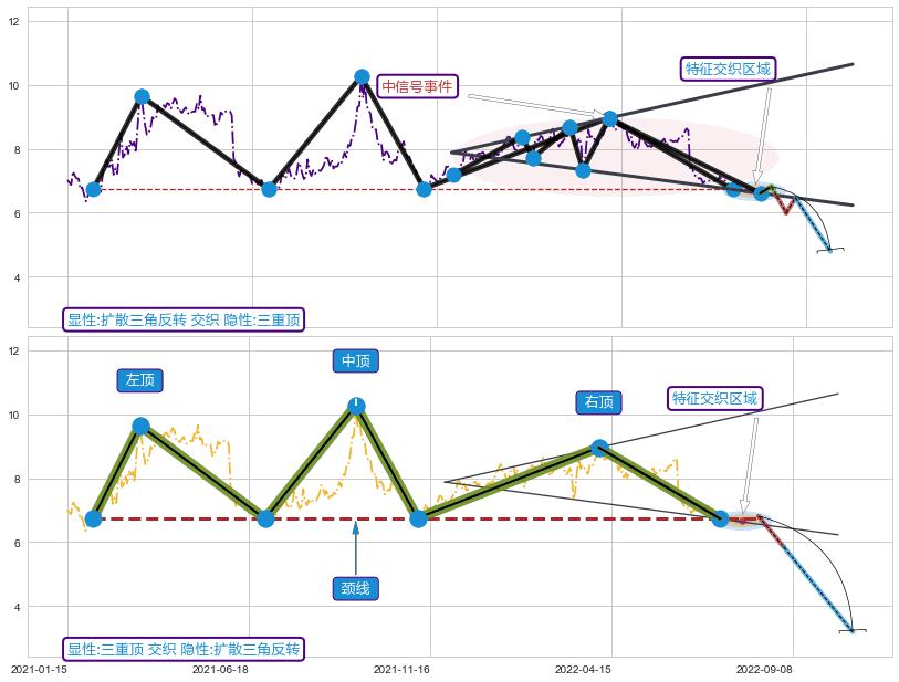 ➢ 顶部尽头线(下山虎) + 扩散三角反转临近支撑猜想转换阻力下跌信号叠加后【反向回撤率】中等,【看空】信号叠加【存续影响中等】