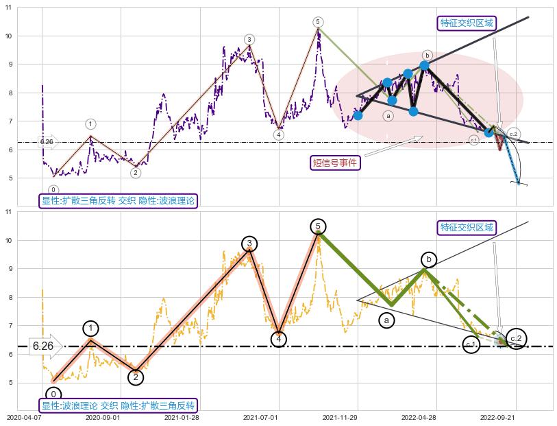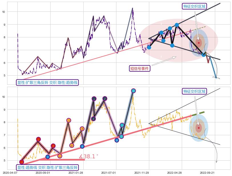 ➣ 扩散三角反转:猜想临近关键支撑位突破点 → 临近拐点下跌 → 风险信号 → 大趋势均值回复