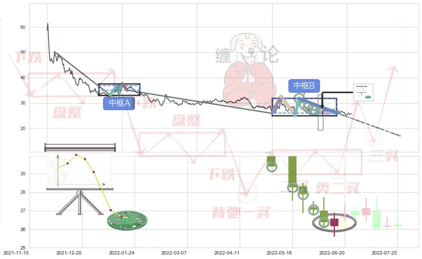 ➣ 【中枢B】:2022-03-09-2022-07-15,中枢由5笔构成,共87交易日, ZG=31.80, ZD=26.06