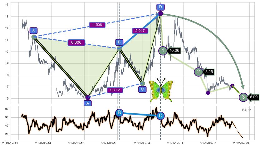 ➢ 谐波蝴蝶:d下跌即将临近第❸目标:猜想支撑拉升 → 上涨 →【拐点】机会信号 → 大趋势均值回复