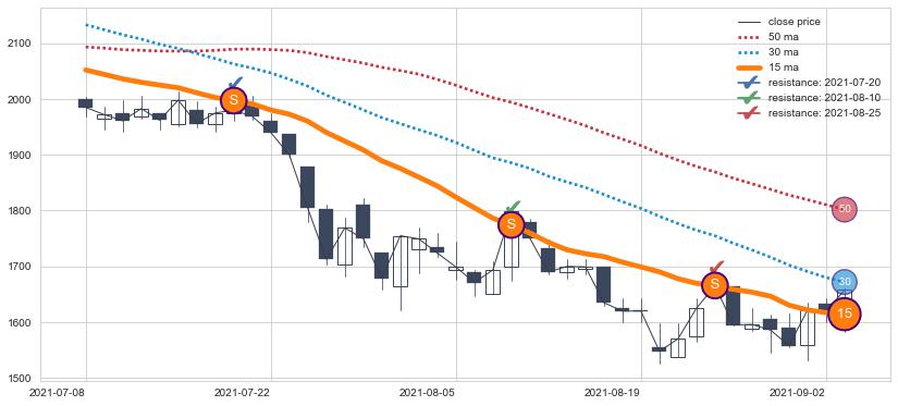 ➣ 历史趋势中共发现15处重要支撑阻力位,其中关键支撑位8处, 关键阻力位7处
