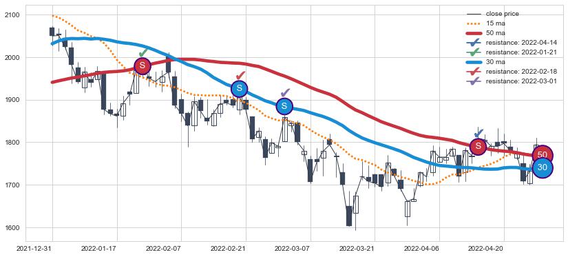 ➢ 最优均线组合共正确确认支撑阻力信号11处,正确确认率 73.33%