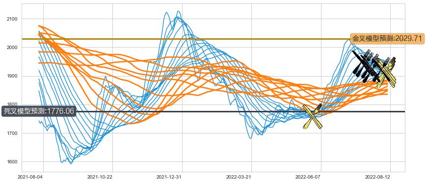➣ 34小时均线于(2022-07-20: 1937.95)形成【死叉】基于【死叉历史模型】预测死叉后最低波谷价格: 1793.01, 死叉后最低价格1876.00,尚未达到预测最低波谷价格, 预期继续下跌