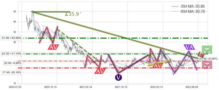 🦴 长线均值回复组合短线趋势跟踪[强阻力信号]2020-08-28-2022-05-20下跌趋势依然成立(下跌趋势跟踪依然存在),短线价格略微上行反弹(均值回复猜想),即将接近下跌趋势提供的未破位阻力价格:21.92。