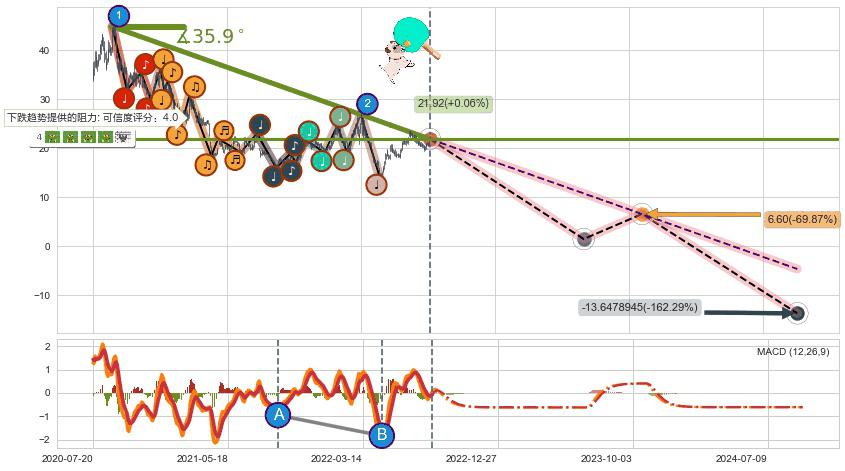 ♘ 在最后的下跌阶段2020-08-28至2022-05-20,存在 持续未破位的阻力位 ,阻力价格21.92,可信任强度82.66%,其距离最后价格21.91相差 +0.06%