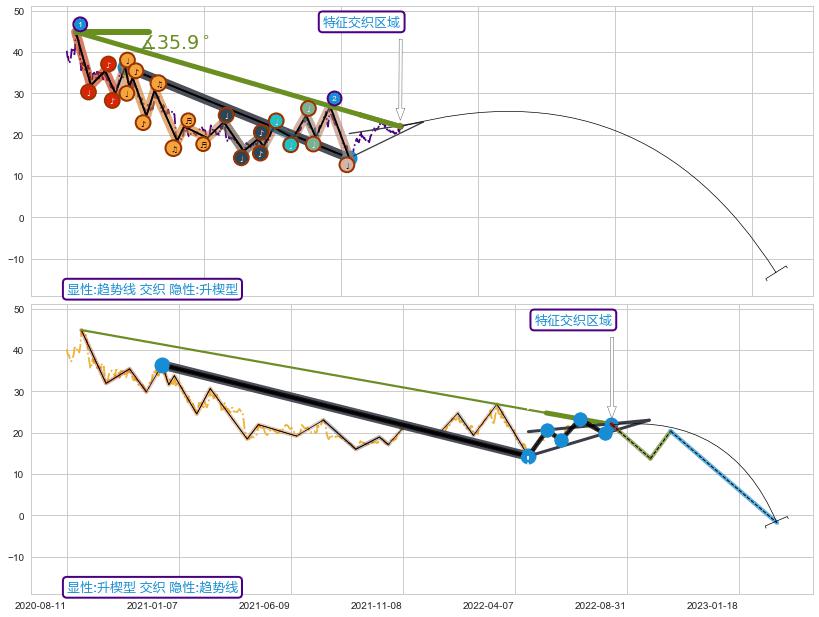 ➣ 趋势线:向上小反弹迎来关键阻力位,猜想强阻力位失守突破,上行击穿原下跌趋势 → 上涨 → 【突破】机会信号 → 大周期均值回复