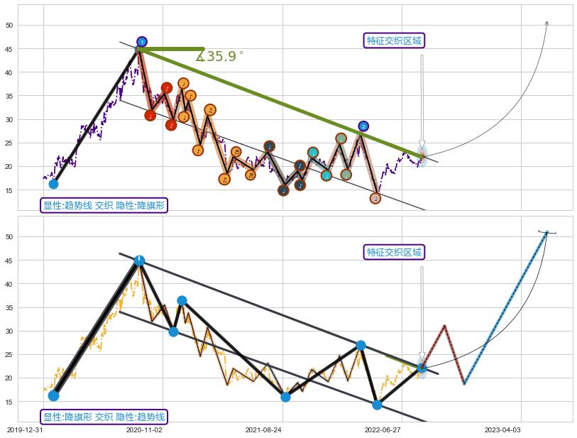 ➣ 降旗形:猜想临近关键阻力位突破点 → 临近拐点上涨 → 机会信号 → 大趋势均值回复