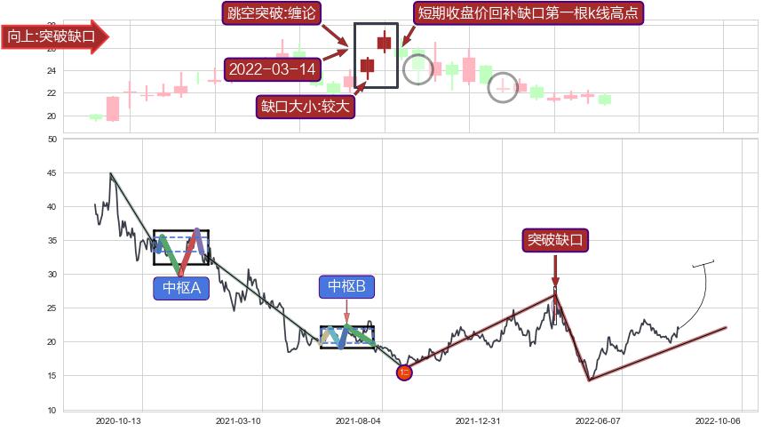 ➣ 突破缺口形成后,后续k已经超过14根,跳空突破缠论突破买卖点3关键点后, 出现【完全回踩】迹象,短期收盘价回补缺口第一根k线高点