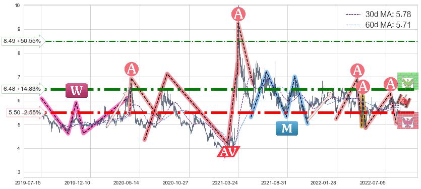 ♘ 阻力价格位6.48,可信任强度97.68%,距离最后交易2022-08-12形成的收盘价格5.64相差 +14.83%
