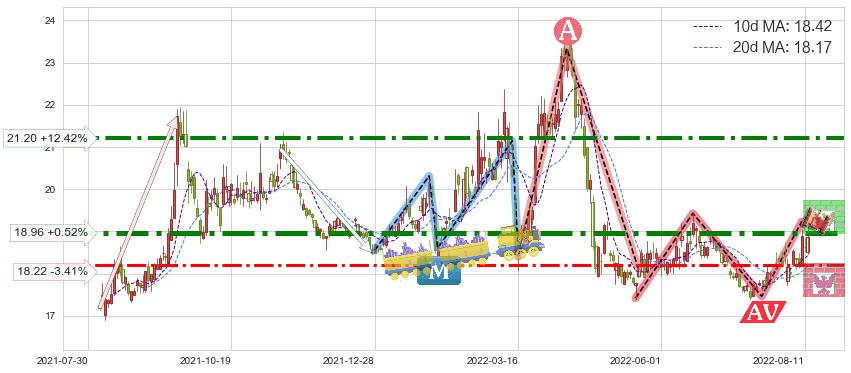 ♘ 支撑价格位18.22,可信任强度63.75%,距离最后交易2022-08-12形成的收盘价格18.86相差 -3.41%