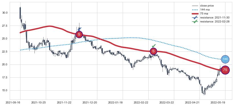 ➣ 75小时均线于(2022-05-17: 18.96)形成【金叉】基于【金叉历史模型】预测金叉后最高波峰价格: 23.02, 金叉后最高价格28.53,已经上涨超出预测最高波峰价格, 预期回调