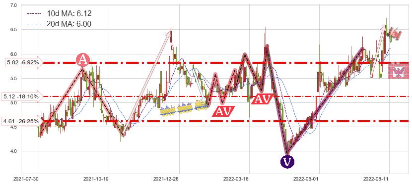 ♘ 支撑价格位5.82,可信任强度81.56%,距离最后交易2022-08-12形成的收盘价格6.25相差 -6.92%