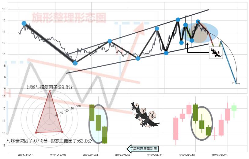 ➢ 下降三部曲(降势三鹤) 🔜 升旗形临近支撑猜想转换阻力下跌 综合量化分数:38.27 【偏空】