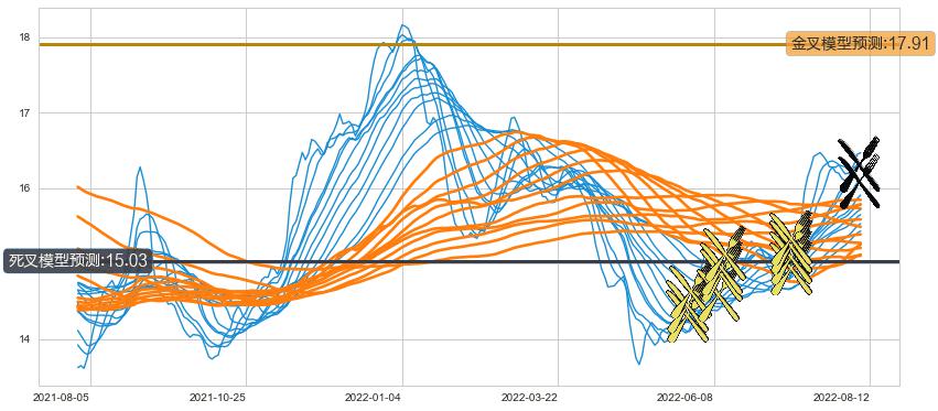 ➢ 25小时均线于(2022-08-11: 16.07)形成【死叉】基于【死叉历史模型】预测死叉后最低波谷价格: 14.97, 死叉后最低价格16.10,已经下跌超出预测最低波谷价格, 预期反弹