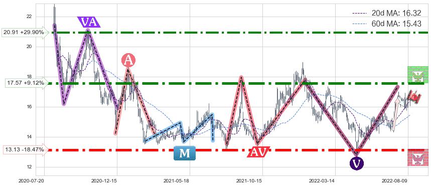 ♘ 阻力价格位17.57,可信任强度93.73%,距离最后交易2022-08-12形成的收盘价格16.10相差 +9.12%