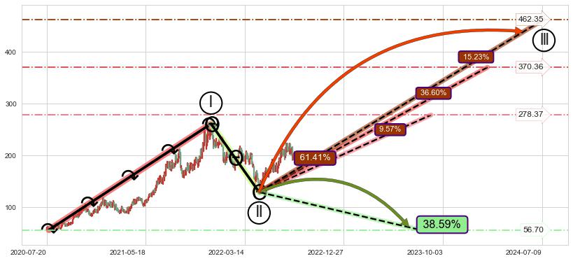 ➣ D点拟合预测价格92.07,距离最后交易收盘价格189.58相差 -51.43%